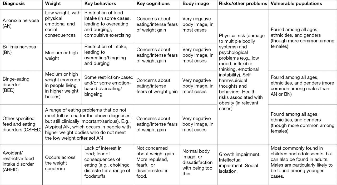 As you will see from Figure 1.1, many eating disorders have overlapping features—body image concerns, trying to avoid eating, overeating, efforts to deal with the consequences of having eaten/overeaten, etc. All of these have their basis in fear and anxiety (e.g., of putting weight on; of others seeing what we look like; fear of the consequences of eating specific foods). While avoidant/restrictive food intake disorder (ARFID) might look the most different on the surface, it too has features that are driven by anxiety. In fact, ARFID is probably the most anxiety based of all eating disorders, as you will see in Chapter 10.