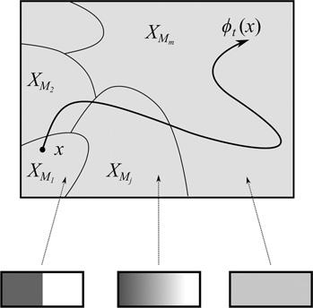 X M 1 ; ... ; X M m g f ,formsapartitionof X,meaningthattheelementsoftheset donotoverlapandjointlycover X.Thisisillustratedin Figure6.Asin Figure2, thelargesquaresymbolisesthestatespace X,andthecurvedthinlinessymbolisethepartitionofthestatespaceintodifferentmacro-regions. Figure6 also showsthatifthesystemunderstudyisagas,thenthemacro-statescorrespond tothedifferentstatesofthegasweencounteredin Section1.1