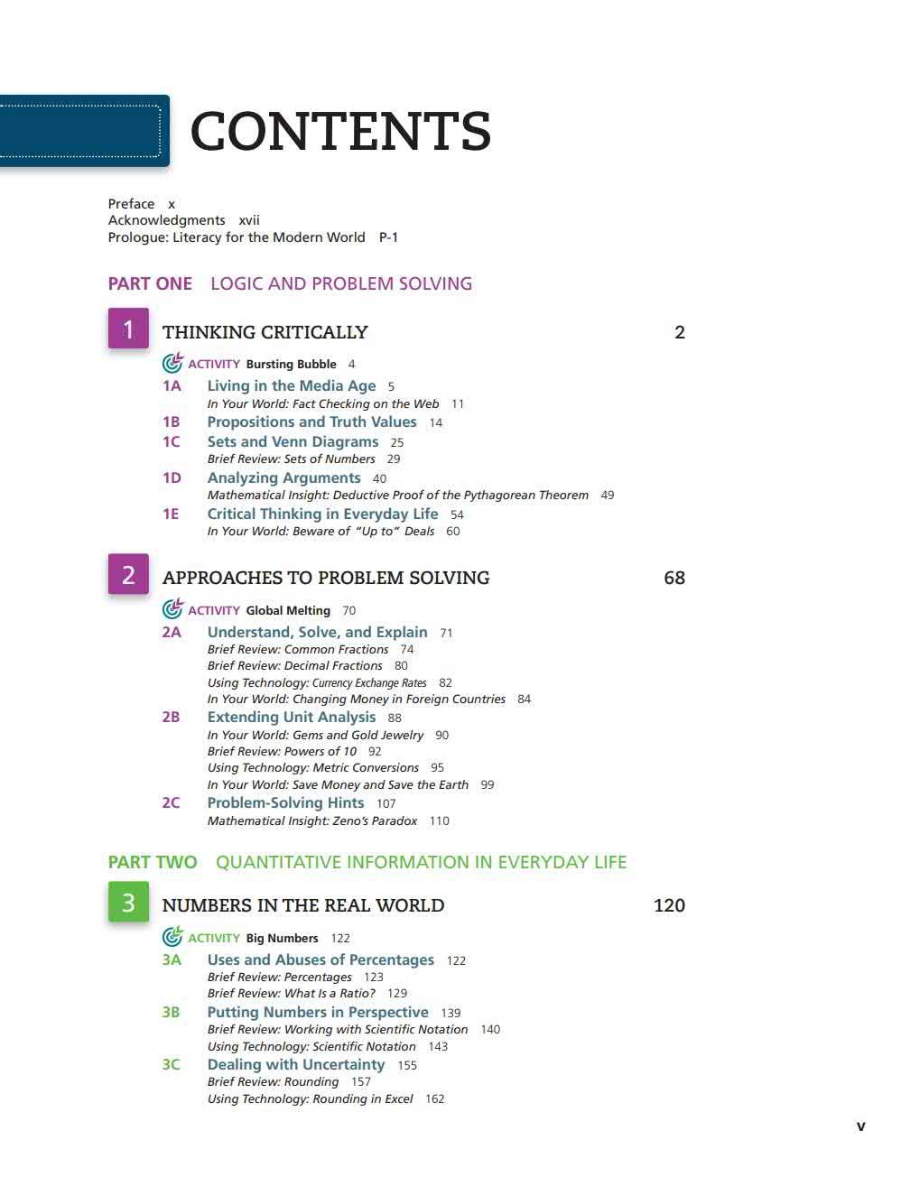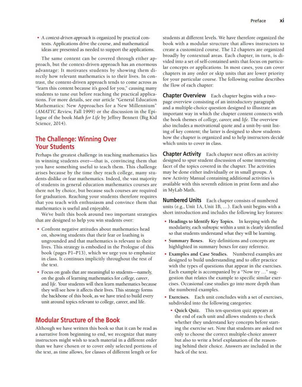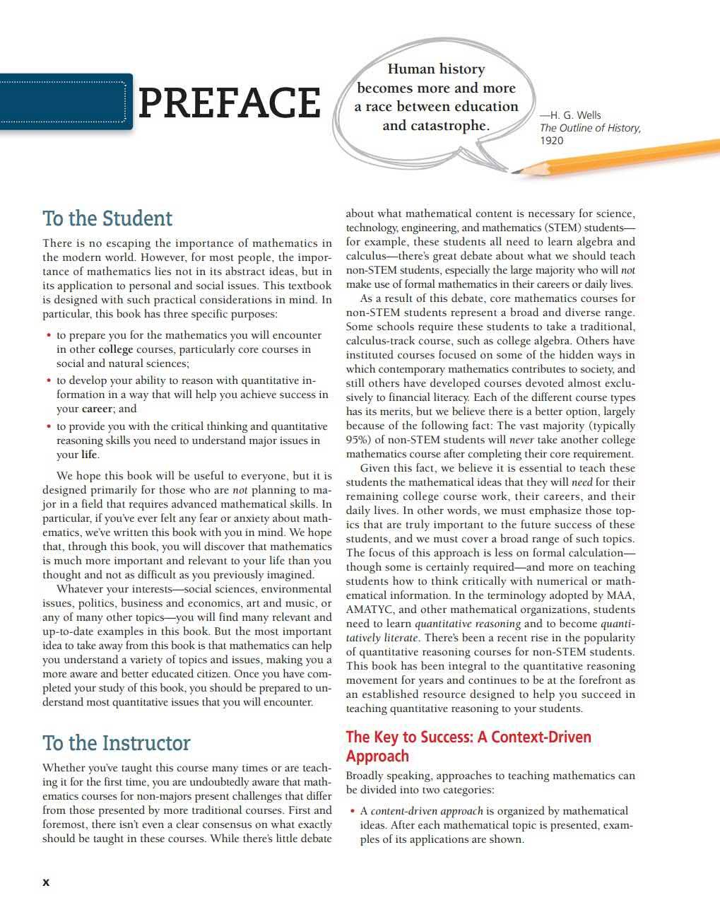 We all use math i n our day-to-day lives. The goa l o f t his book is to imp rove students' mathematical lite racy so that t hey can use math mo re effective ly in everyday li f e. Mathematics can hel p students bette r u nde rsta nd a va riety of top ics and issues, making t hem mor e awa re of t he uses and abuses of numbe rs. The u lt imate goa l is to help t hem become bette r educated cit ize ns who are successfu l in t heir co llege experiences, the ir careers, and the ir lives.