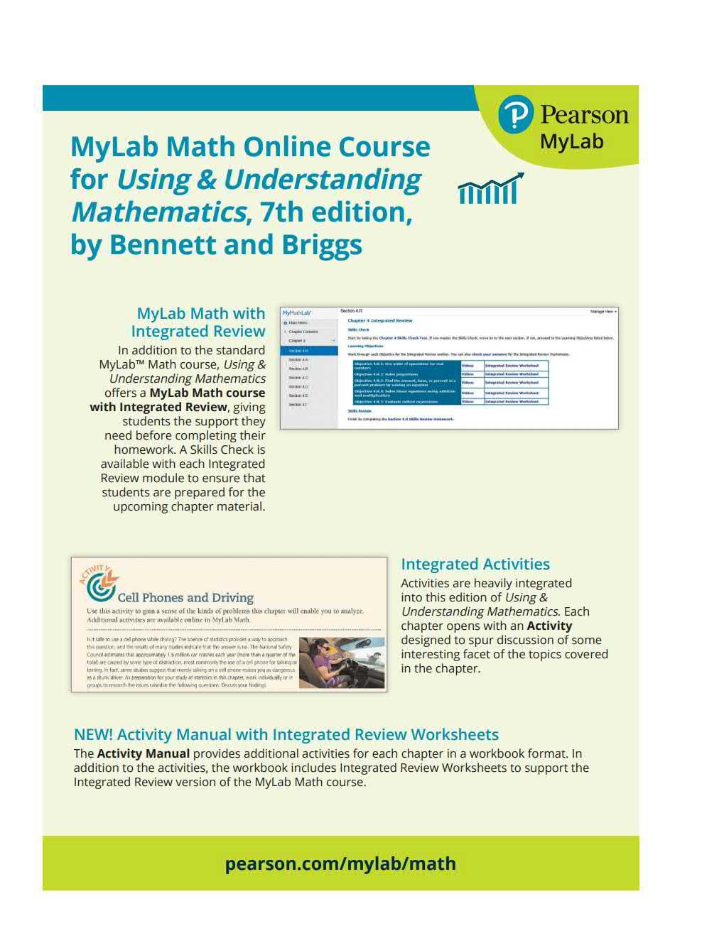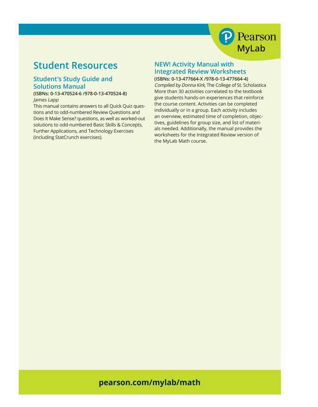 The Ac t ivity M an u al provides additional activities for each chapt er in a workbook format. In add it ion t o th e activities, the workbook includes Integrated Review Worksheets t o su pport the Integrated Review version of the Mylab Math course.