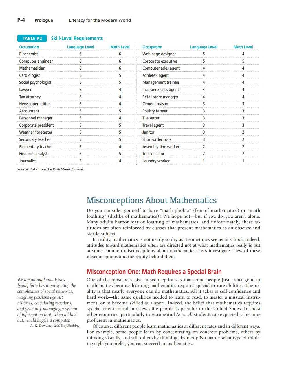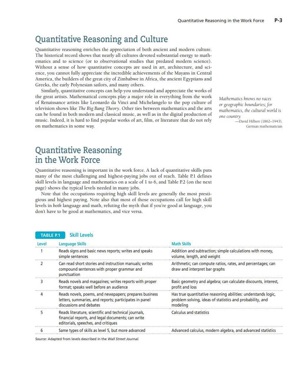 Quantitative reasoni ng is important in the work force. A l ack of q u antitative skills p u ts many o f the most challenging and highest- paying jobs o u t of reach. Tabl e P. l defines skill levels in l ang u age and mathematics on a scale of 1 to 6, and Table P.2 (on the next page) shows the typical l evels needed in ma n y j obs