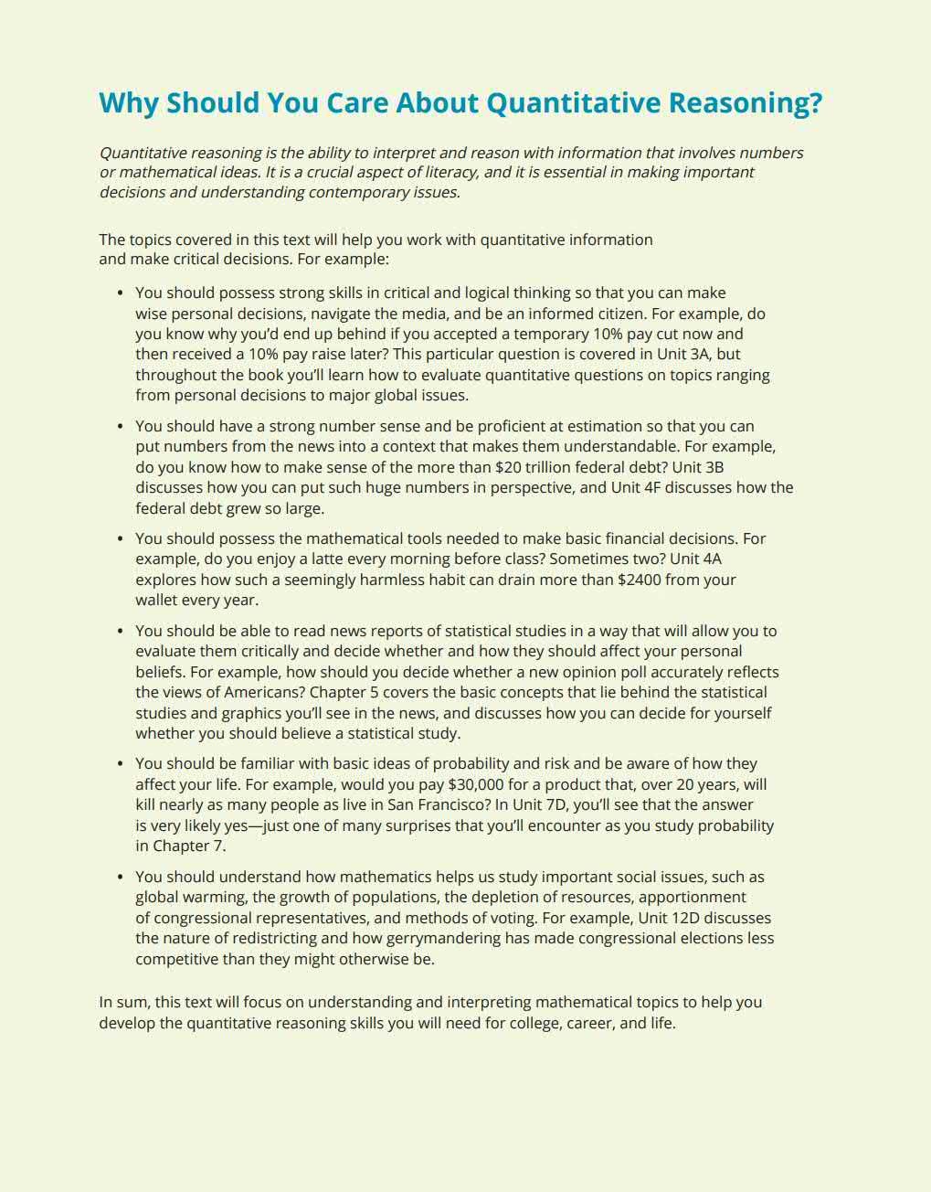 In sum, this text w ill focus on understand ing and interpreti ng mathematical topics to help yo u develop t he q uantitative reasoni ng skills you will need for college, career, and life.