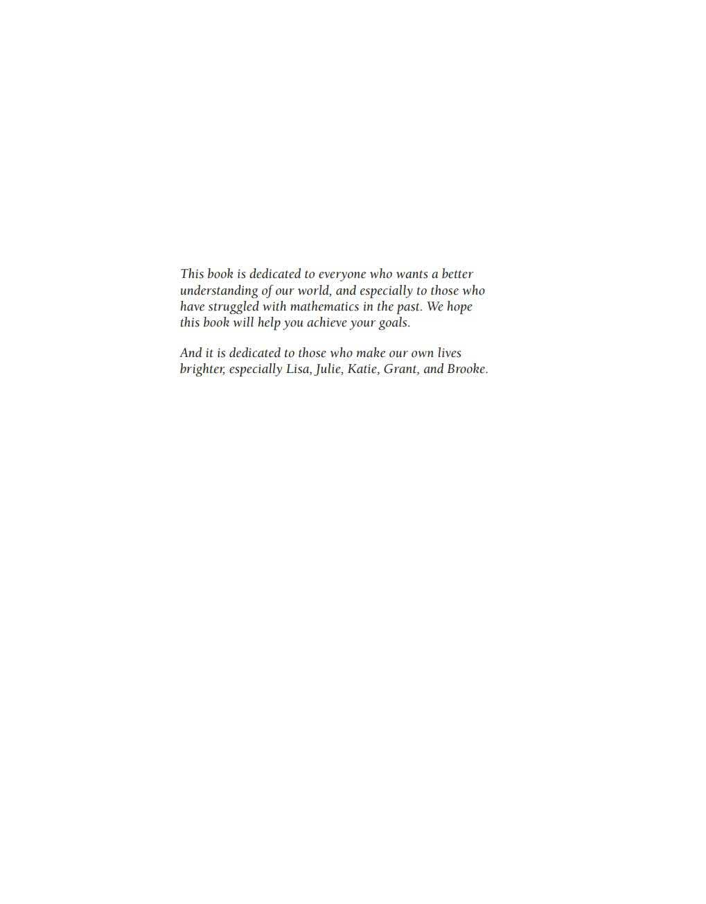This book is dedicated to everyone who wants a better understanding of our world, and especially to those who have struggled with mathematics in the past. We hope this book will help you achieve your goals.