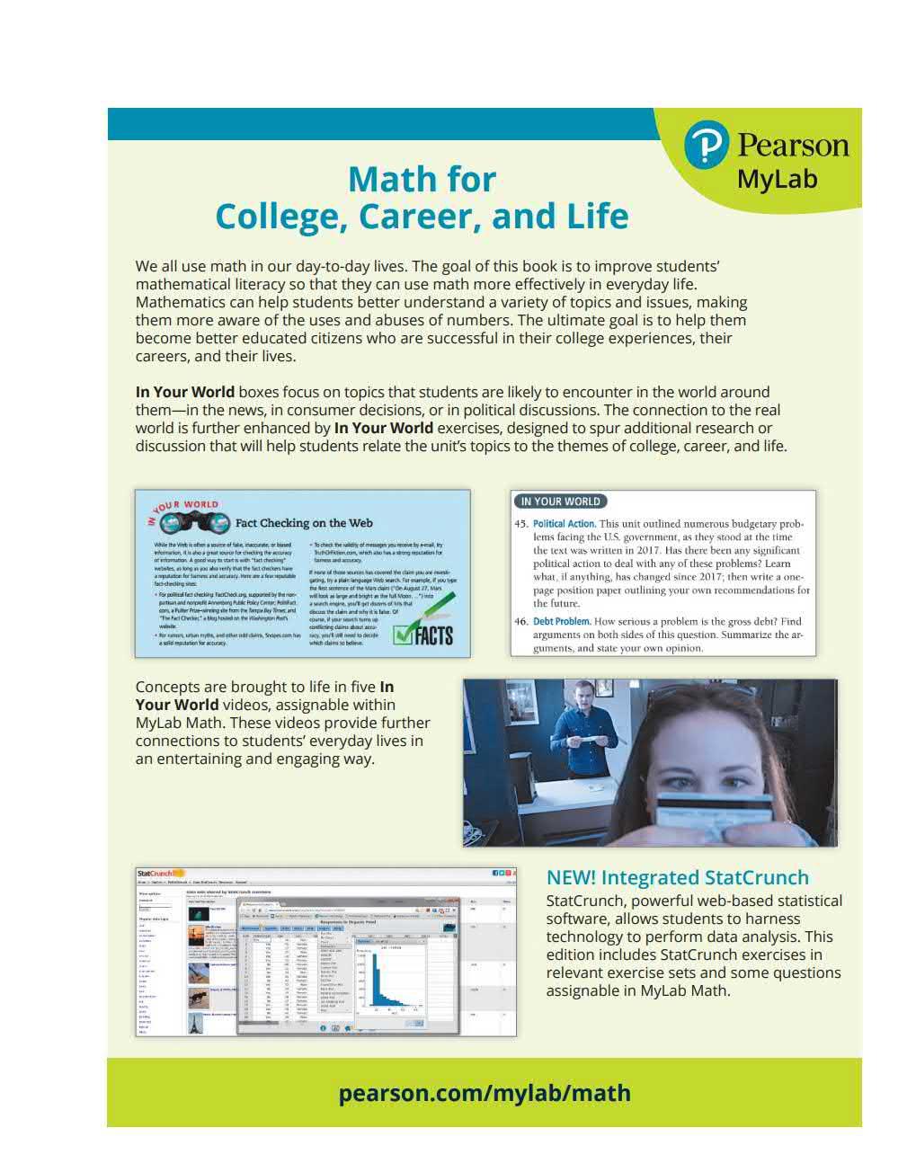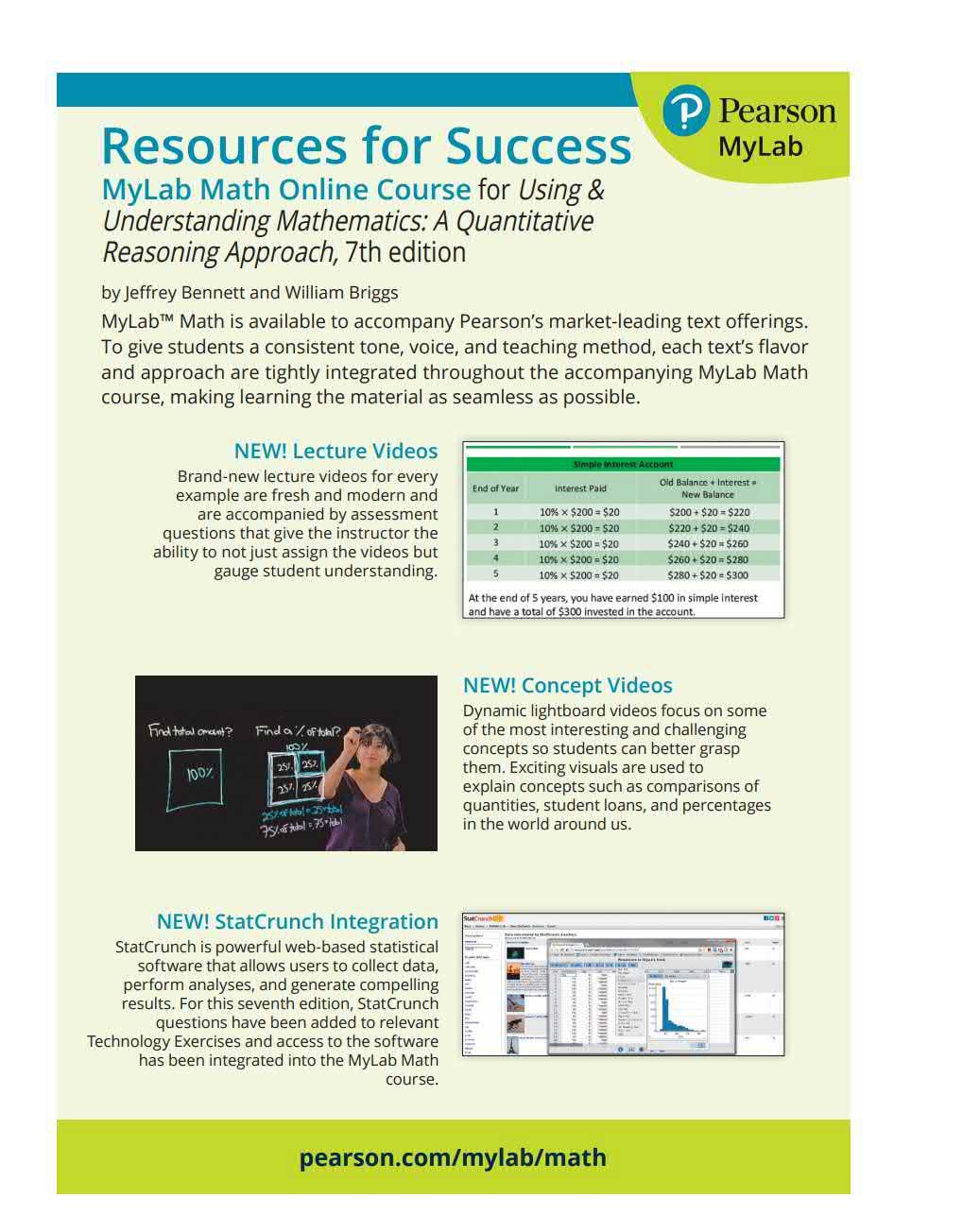 StatCru nch, powerfu l web -based statistica l softwa re, allows students to harness techno logy to pe rform data ana lysis. This ed it ion includes StatCrunch exercises in relevant exercise sets and some questions assignable in Mylab Math.