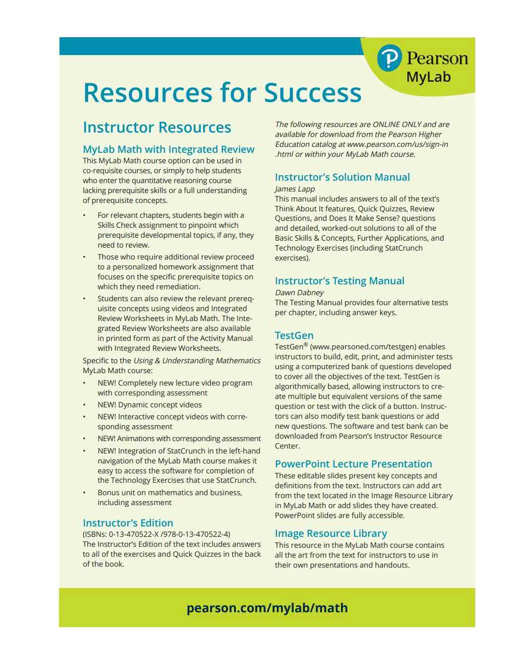 In addition t o t he st andard Mylab"' Math course, Using & Understanding Mathematics offers a M yla b Math co u rse with In t egr at ed Revi ew, givi ng stu dent s th e su pport they need before completing their homewor k. A Skills Check is availa ble w it h each Integrat ed Review module t o ensure th at students ar e prepared for t he upcoming cha pter material.