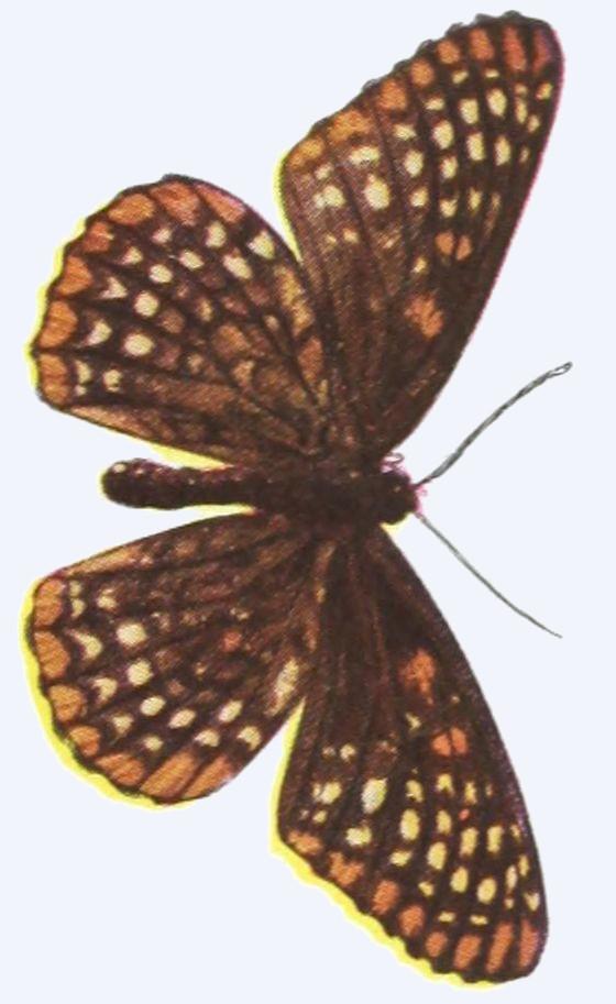 Generally small or medium-sized butterflies. Palpi not swollen; the third joint finely pointed; clothed with long hairs. Antennæ about half as long as the costal margin of fore wing, ending with a short, heavy, spoon-shaped knob. The cell in the fore wing is closed, in the hind wing open. The spots and markings are differently arranged from those in Argynnisand Brenthis; the wings are never silvered on the under side. Eggs subconical, flattened on top, fluted on the sides. Caterpillars gregarious when young, then separating; cylindrical, covered with short spines set with diverging hairs; feeding upon the Scrophulariaceæ, Castileja, and allied plants. Chrysalis rounded at the head, with sharply pointed tubercles on back, white or pale gray, adorned with dark markings and orange spots on back.