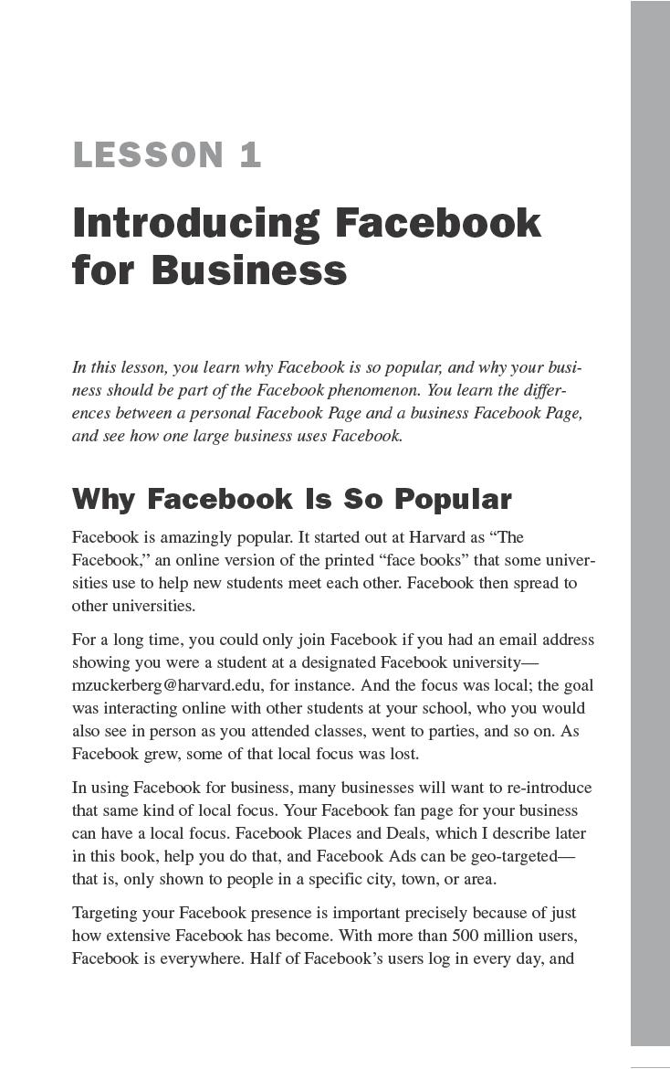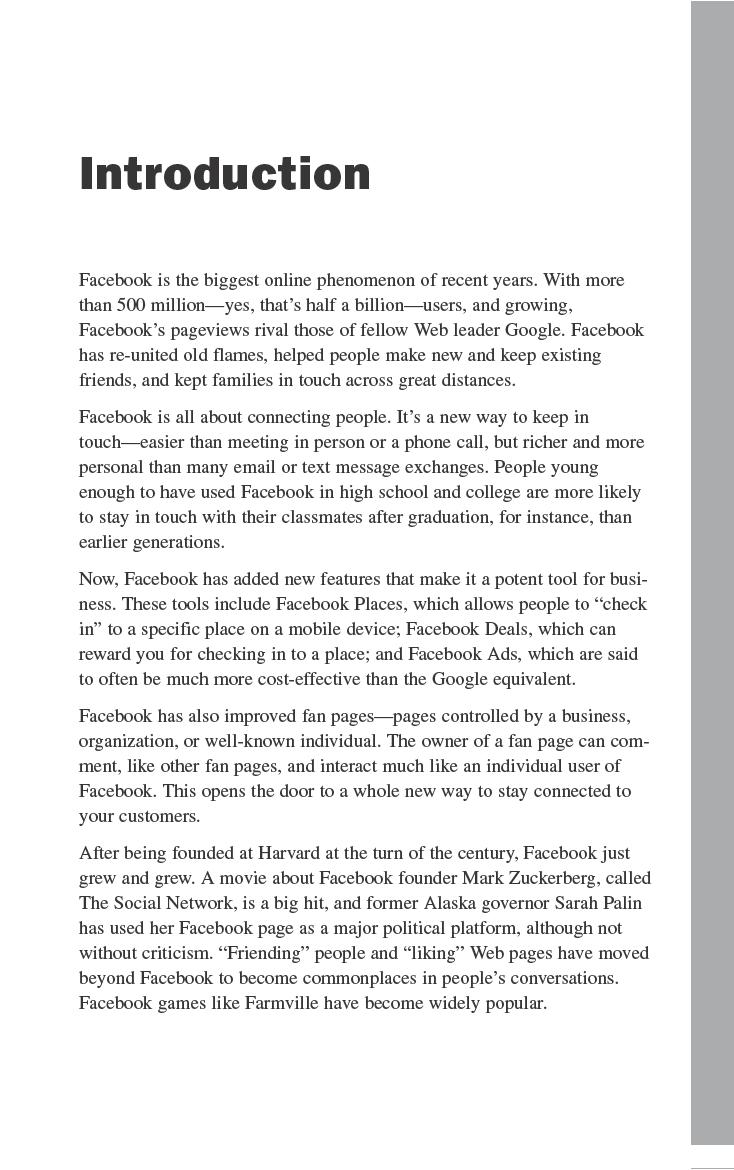 This book really delves into the business uses of Facebook; as far as using Facebook goes, there’s only a brief overview of Facebook basics here. If you need an introductory guide to get you warmed up, start with Sams Teach Yourself Facebook in 10 Minutes. Create a personal Facebook page and get some experience with making Facebook friends, so you know what’s going on.
