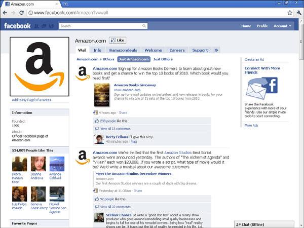 Consider a local bookstore. Every local bookstore competes with Amazon.com, and Amazon has more than 500,000 Facebook fans at this point (that is, people who’ve clicked the Like button on Amazon’s Facebook Page, as shown in Figure 1.3).