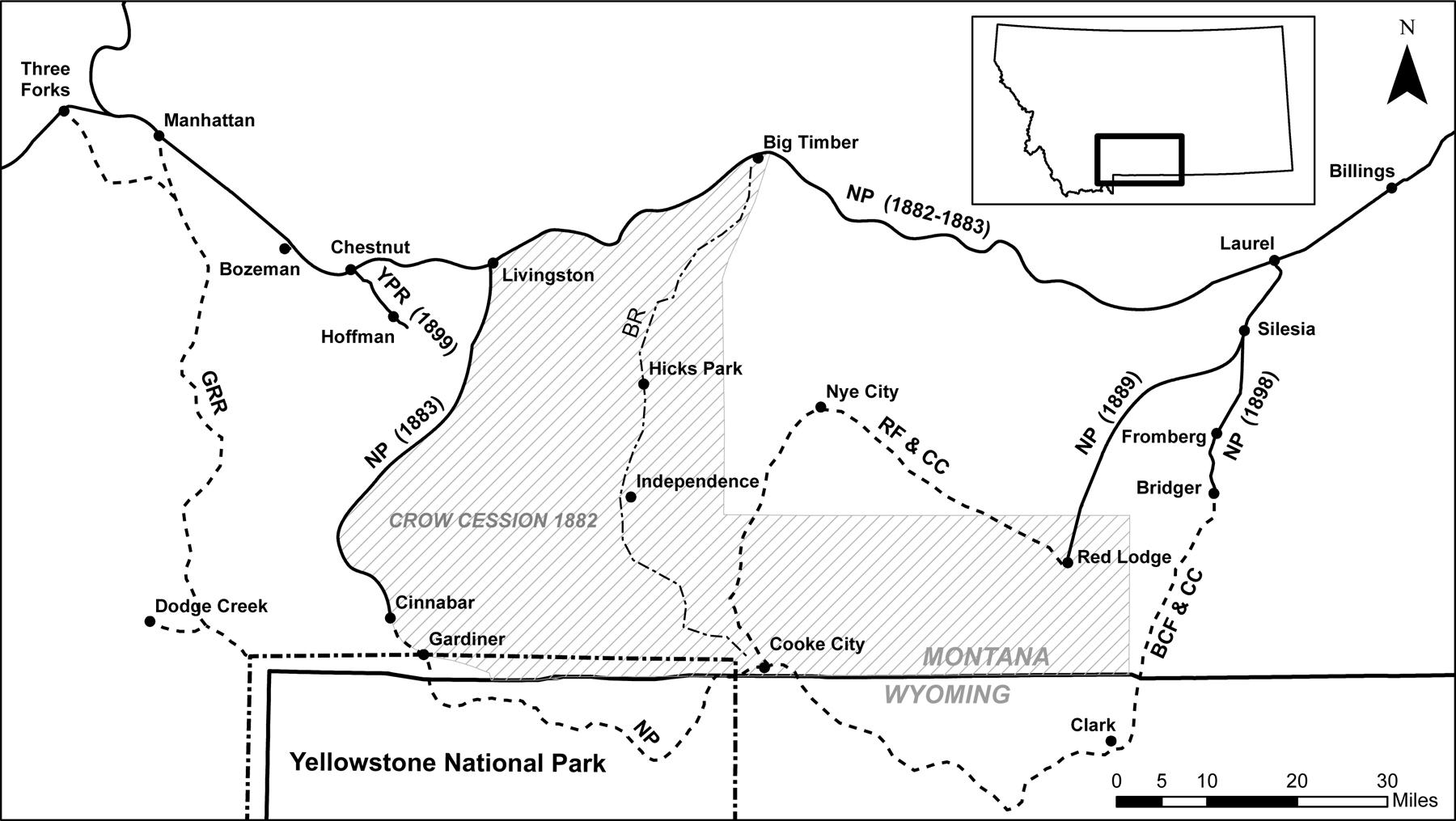 Map of south-central Montana showing the Crow Cession of 1882 and railroad development through 1900. NP (Northern Pacific); YPR (Yellowstone Park Railway); proposed lines: GRR (Gallatin Railroad); RF&CC (Rocky Fork & Cooke City); BCF&CC (Billings, Clark’s Fork & Cooke City); BR (Boulder River route).