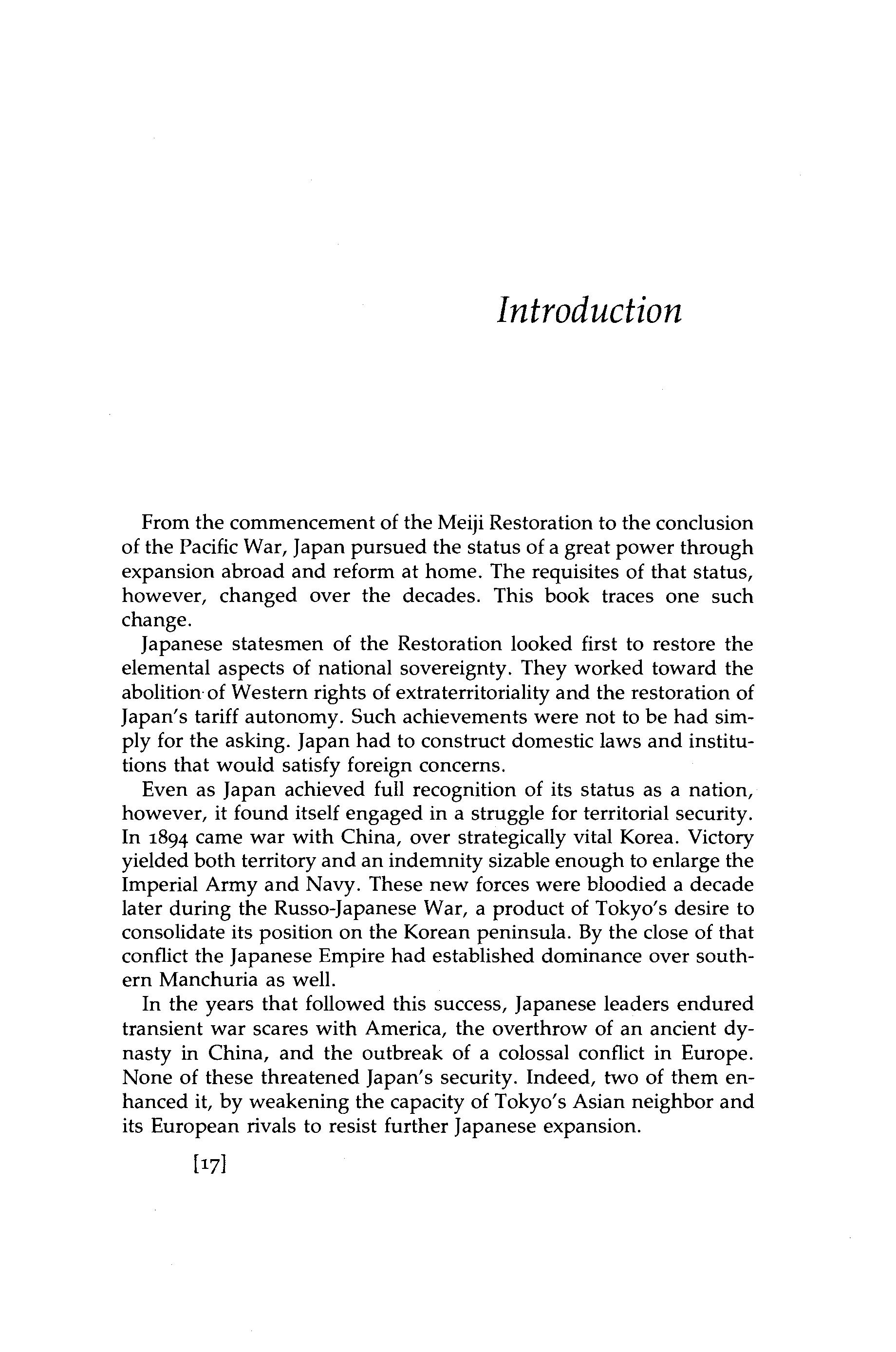 From the commencement of the Meiji Restoration to the conclusion of the Pacific War, Japan pursued the status of a great power through expansion abroad and reform at home. The requisites of that status, however, changed over the decades. This book traces one such change.
