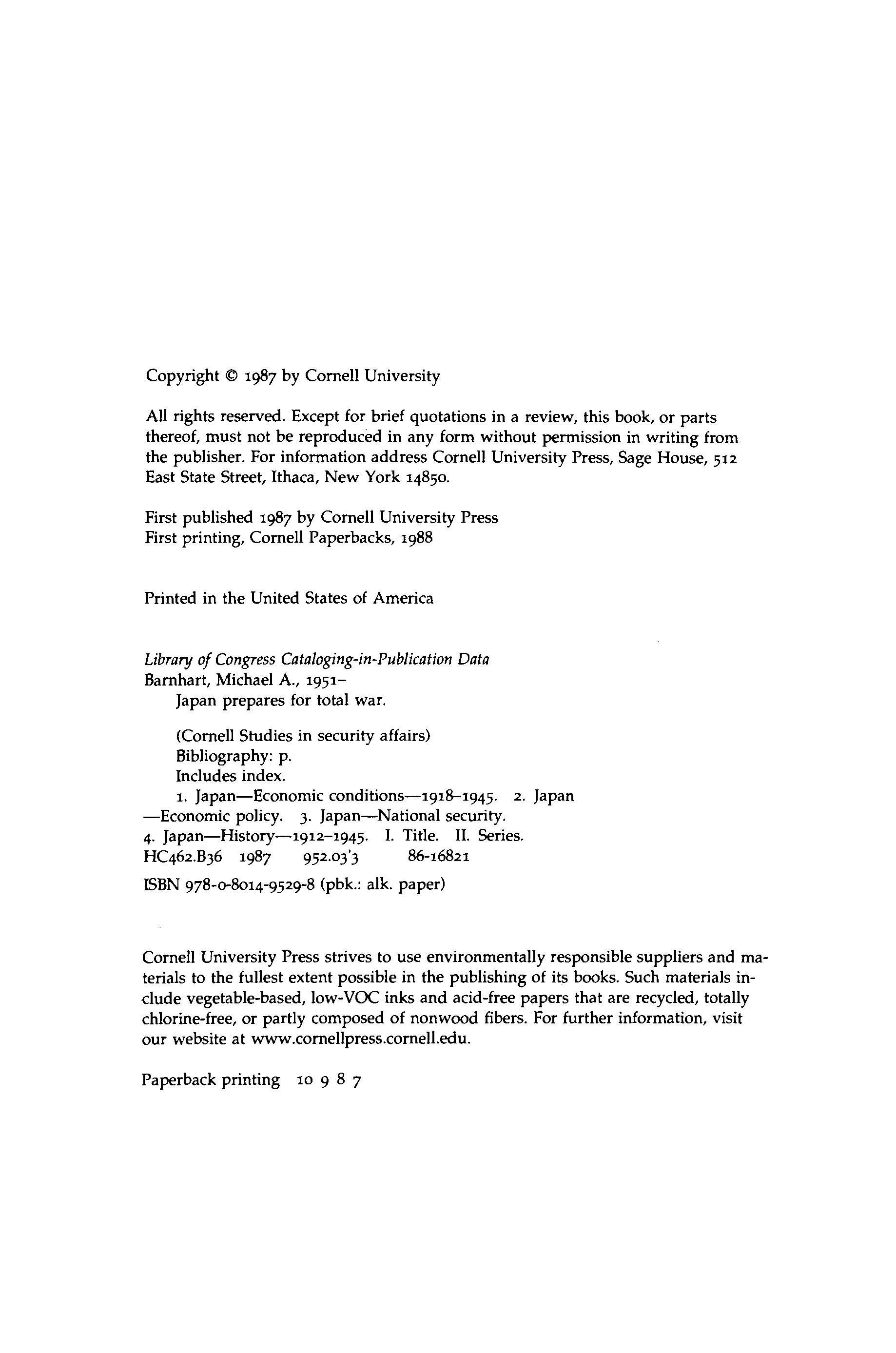 Without librarians and archivists, the craft of history would be impossible. Special thanks are due the staffs of Houghton and Widener libraries at Harvard University, the Sterling Memorial Library of Yale University, the Hoover Institution of Revolution, War, and Peace collection at Stanford University, the Herbert Hoover and Franklin D. Roosevelt presidential libraries, and the National Diet Library in Tokyo. Archivists at the National Archives, in Washington and at the Suitland annex, were most helpful, as were their counterparts at the Library of Congress, especially Key Kobayashi of the Orientalia Division, who permitted me to explore his holdings of crumbly South Manchurian Railway studies at leisure and to my content. Although not archivists in the true sense, the many compilers of the lOo-volume-plus official Boeicho history and the spectacular Gendaishi shiryo series merit thanks for their bringing literally thousands of documents to light in an easily accessible form. Most valuable in this respect for my particular purposes was the tireless work of Ishigawa Junkichi, whose collection of mobilization documents was truly indispensable.