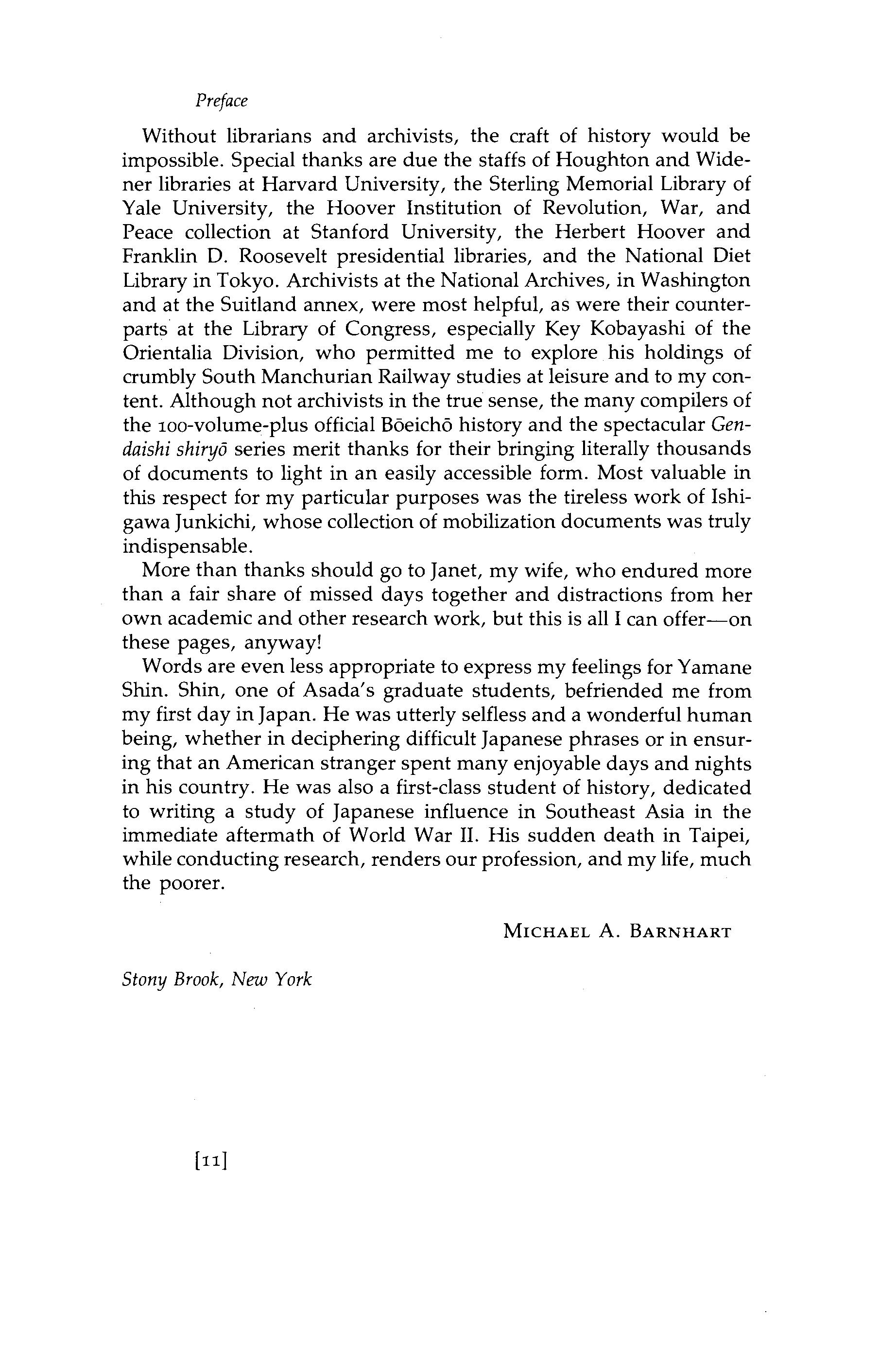 Words are even less appropriate to express my feelings for Yamane Shin. Shin, one of Asada's graduate students, befriended me from my first day in Japan. He was utterly selfless and a wonderful human being, whether in deciphering difficult Japanese phrases or in ensuring that an American stranger spent many enjoyable days and nights in his country. He was also a first-class student of history, dedicated to writing a study of Japanese influence in Southeast Asia in the immediate aftermath of World War II. His sudden death in Taipei, while conducting research, renders our profession, and my life, much the poorer.