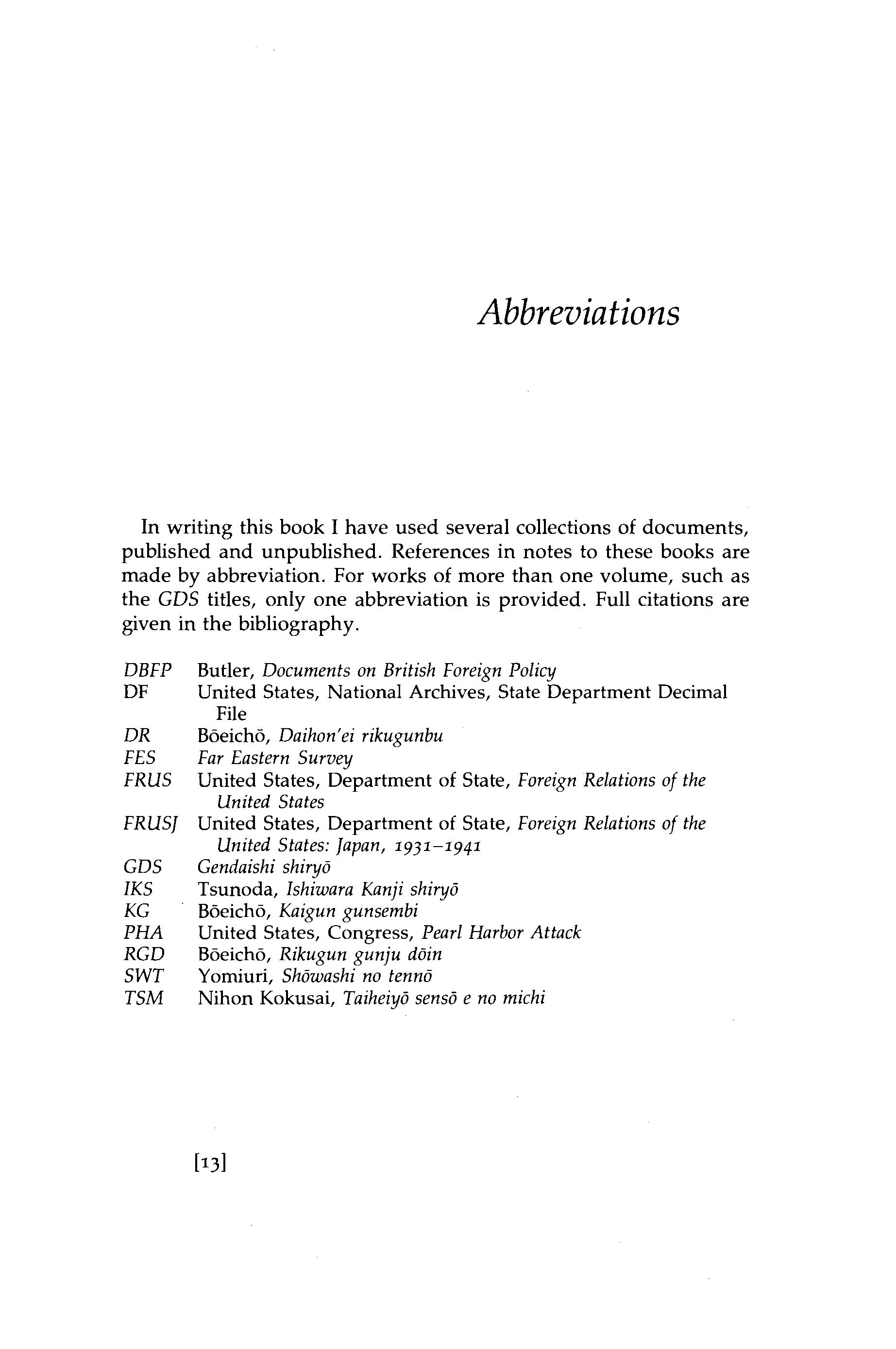 Throughout this book, Japanese proper names are given in Japanese order: family name first followed by given name. For given names, it is not uncommon for Japanese ideograms to carry more than one pronunciation, which in a phonetic language such as English yields more than one possible spelling. In these cases I use the pronunciation as specified by furigana in Nihon Kindai Shiryo Kenkyukai, ed., Nihon Riku-Kaigun no seido, soshiki, jinji (Tokyo: Tokyo Daigaku Shuppankai, 1971), a directory of army and navy personnel and organization. When most other scholarly works use a different spelling, I provide that alternative in a footnote and give a crossreference in the index. Whenever possible, Chinese names and places are rendered by the Wade-Giles, not the Pinyin, system.