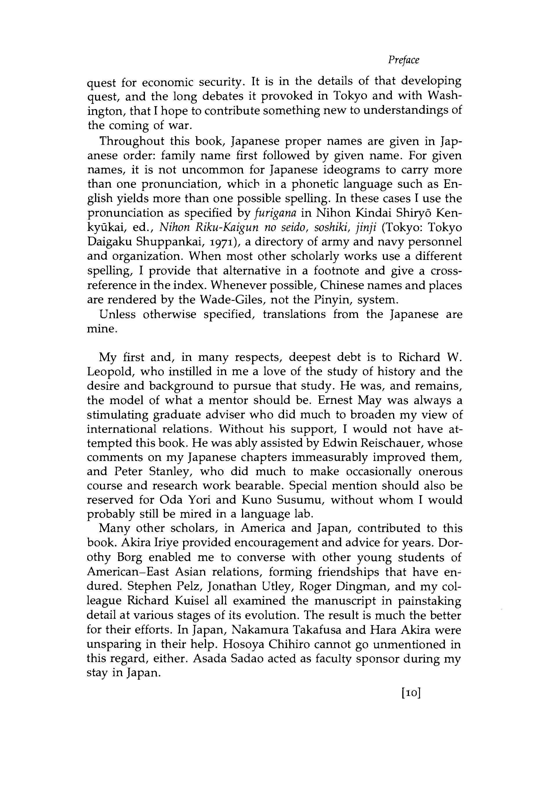 My first and, in many respects, deepest debt is to Richard W. Leopold, who instilled in me a love of the study of history and the desire and background to pursue that study. He was, and remains, the model of what a mentor should be. Ernest May was always a stimulating graduate adviser who did much to broaden my view of international relations. Without his support, I would not have attempted this book. He was ably assisted by Edwin Reischauer, whose comments on my Japanese chapters immeasurably improved them, and Peter Stanley, who did much to make occasionally onerous course and research work bearable. Special mention should also be reserved for Oda Yori and Kuno Susumu, without whom I would probably still be mired in a language lab.