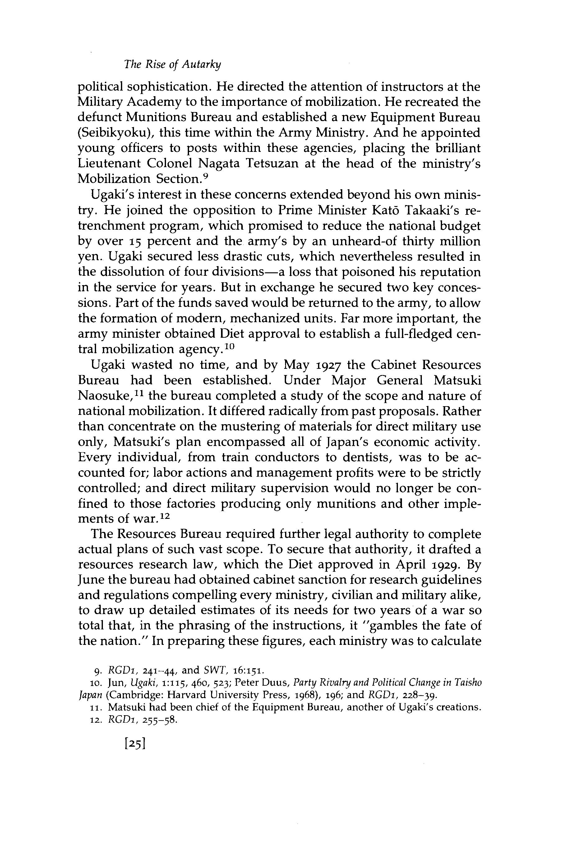 Ugaki's interest in these concerns extended beyond his own ministry. He joined the opposition to Prime Minister Kata Takaaki's retrenchment program, which promised to reduce the national budget by over 15 percent and the army's by an unheard-of thirty million yen. Ugaki secured less drastic cuts, which nevertheless resulted in the dissolution of four divisions-a loss that poisoned his reputation in the service for years. But in exchange he secured two key concessions. Part of the funds saved would be returned to the army, to allow the formation of modern, mechanized units. Far more important, the army minister obtained Diet approval to establish a full-fledged central mobilization agency.lO