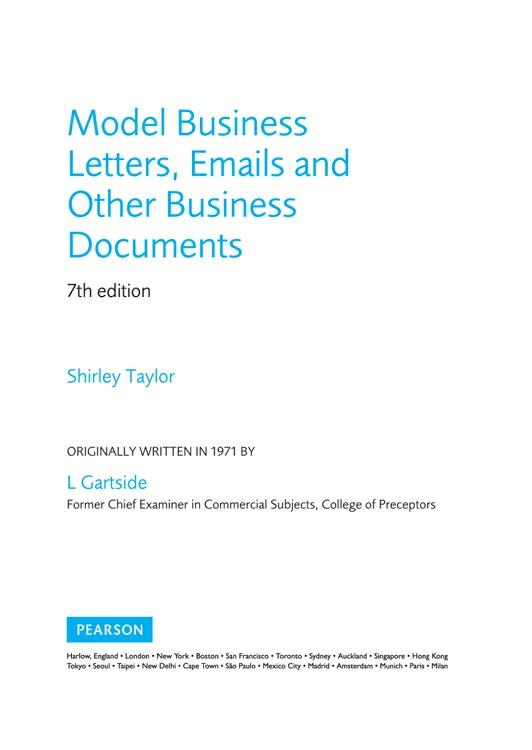 Abouttheauthor ShirleyTaylorhasestablishedherselfasaleadingauthorityinmodernbusiness writingandcommunicationskills.Her booksarepopular all over theworld,and havebeentranslatedintomanylanguages.
