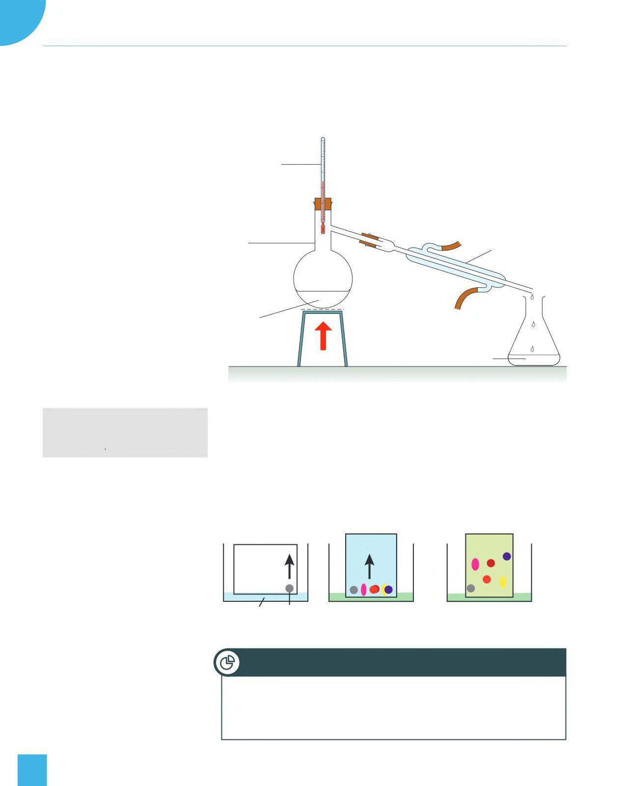 Distillation can be usedto separate miscible liquids with dierentboiling points, suchasethanolandwater Ethanolhasalowerboilingpointandwillevaporaterst Once the vapours rise up a coolingcolumn,they can be condensedto a liquid.As shown in gure 8, coldwater surrounds the condenser andallows the vapours to condense to liquidethanol.The water remains mostly in the distillation ask.