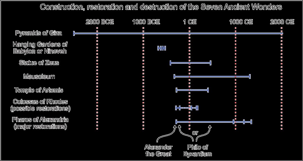 Figure 1-2: Timelines of the Ancient Wonders. Dates bce (Before Common Era) are numerically equal to bc and dates ce (Common Era) are equivalent to ad. Image by the author.