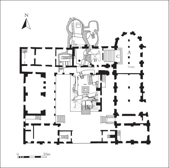 Figure 0.3. Convent plan and location of its ‘Cellar’. A = convent chapel; B = convent museum; C = modern stairway to Cellar. Drawn by Ifan Edwards for the Nazareth Archaeological Project. From The Sisters of Nazareth convent. A Roman-period, Byzantine and Crusader site in central Nazareth, 1st ed., by Ken Dark, copyright 2021 by Imprint; reproduced by permission of Taylor & Francis Group.