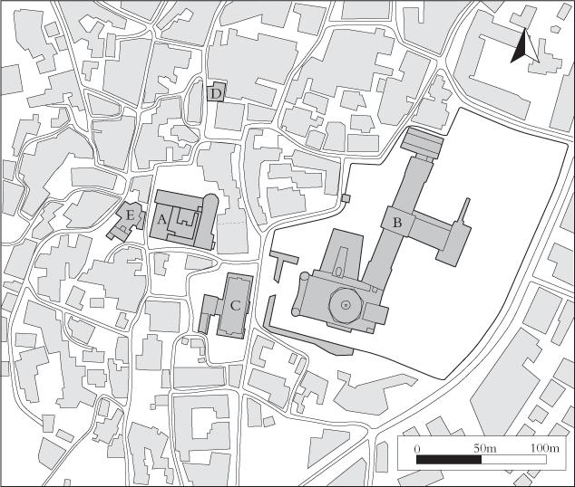 Figure 0.2. The city centre of Nazareth, showing: A = Sisters of Nazareth convent; B = Church of the Annunciation complex; C = Casa Nova hostel; D = Synagogue Church; E = Anglican church.