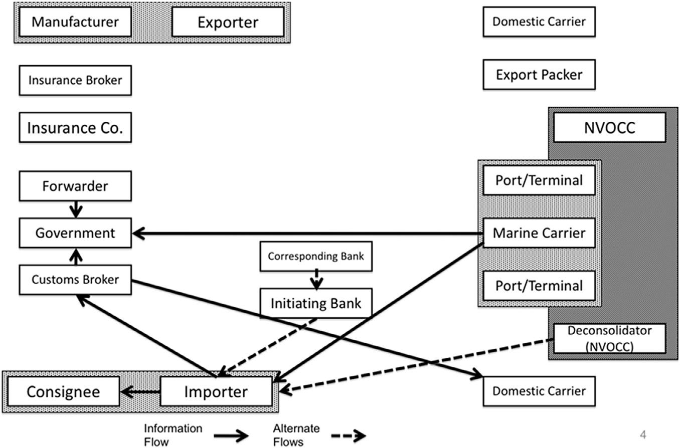 Thecomplexitybecomesobviouswherenotonlytheactivitiesoftheimporterarecombined withthoseoftheexporter,butwhenthephysical,information,andfinancialflowsarealso takenintoconsideration.Itbecomesobvious,asshownin Fig.1.8,thatthepermutationsof participantsanddataelementscannumberinthehundreds.Somepartieswillpossessallof thedetailsofaparticularshipment,whileotherswillhaveonlyscantorlimitedknowledge.