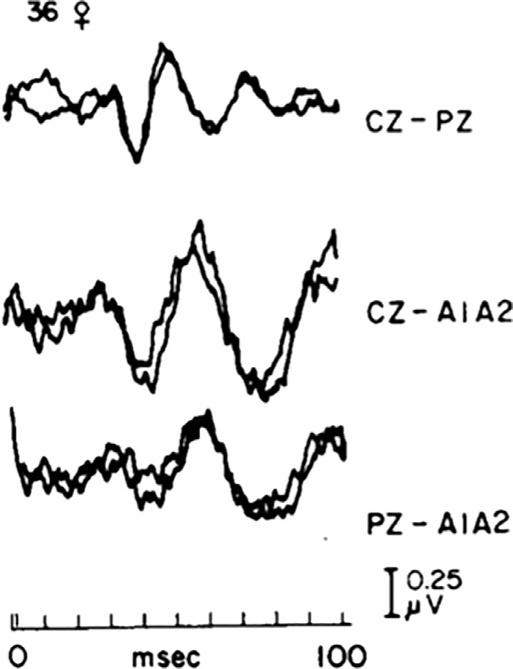 Fig.1.2. Methodsweredevelopedtoproducebetter,reproducibleSEPs.Bipolarrecordingsshownhereonthetopline werelessnoisyandmorereproduciblethanreferentialrecordings.Stimulationherewasposteriortibialnerveandrecording useda30Hzlowfrequencyfilter.FromNuwer,M.R., Dawson,E.C.,1984.Intraoperativeevokedpotentialmonitoringofthespinalcord:enhancedstabilityofcorticalrecordings. ElectroencephalogrClinNeurophysiol59,318–327.
