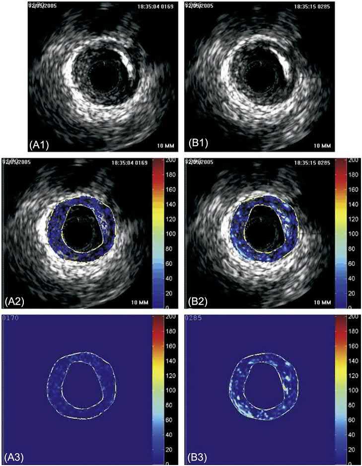 FIG.4 CE-IVUS.AnalysisofanimageobtainedbyIVUSusingtheACESsystem,before(A)andafter(B)the infusionofcontrastmicrobubbles.(1)InitialIVUSimage;(2)IVUSimagefromtheregionoftheplaqueunder analysis;and(3)resultofprocessingwithouttheoriginalimage.