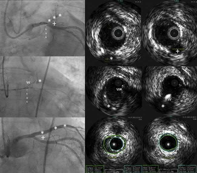 FIG.5 IVUSperformedduringaCTOPCIprocedure.Atotallyoccludedleftanteriordescending(LAD)arteryat theleveloftheostiumispointedontheangiogramonthe topleft by *** Topright,onthecorrespondingIVUS crosssectionobtainedjustdistallytotheoriginoftheLAD,withthecatheterintheleftcircumflexartery(Cx),a smallsidebranchismarkedby+,alsovisibleontheangiogram.TheIVUScrosssectioninthemiddlejustmore proximallyshowstheoriginoftheLAD(*). Middlepanel,left,showstheangiogramduringthefunctionofthe proximalcapoftheLADwithawire(w)thatcanalsobefollowedontheIVUSimagesinrealtime.The lowerpanel showsthestentedLADandtheIVUSassessmentofstentexpansionintheLAD (middlepanel) anditsdistal reference.