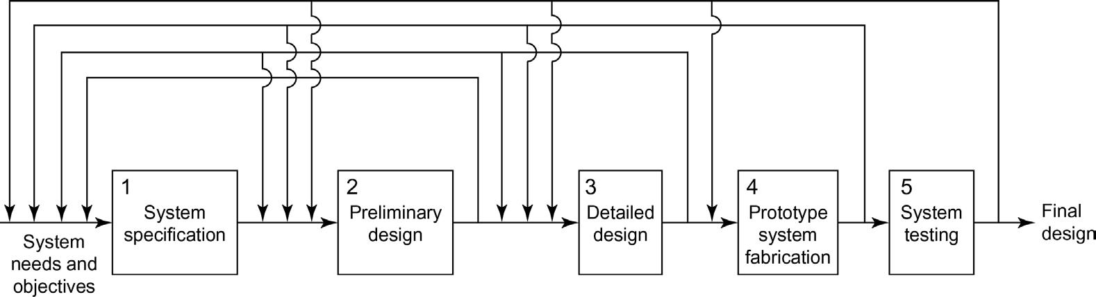 4. The fourth and fifth steps shown in Fig. 1.1 may or may not be necessary for all systems. They involve fabrication of a prototype system and testing, and are necessary when the system must be mass-produced or when human lives are involved. These steps may appear to be the final ones in the design process, but they are not because the system may not perform according to specifications during the testing phase. Therefore, the specifications may have to be modified or other concepts may have to be studied. In fact, this reexamination may be necessary at any point during the design process. It is for this reason that feedback loops are placed at every stage of the system evolution process, as shown in Fig. 1.1. This iterative process must be continued until the best system evolves.