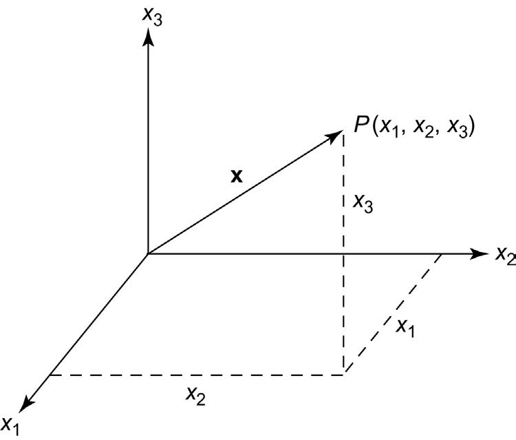 In 3-dimensional (3D) space, the vector x = [x1 x2 x3]T represents a point P, as shown in Fig. 1.3. Similarly, when there are n components in a vector, as in Eqs. (1.1) and (1.2), x is interpreted as a point in the n-dimensional space, denoted as Rn. The space Rn is simply the collection of all n-dimensional vectors (points) of real numbers. For example, the real line is R1, the plane is R2 , and so on.