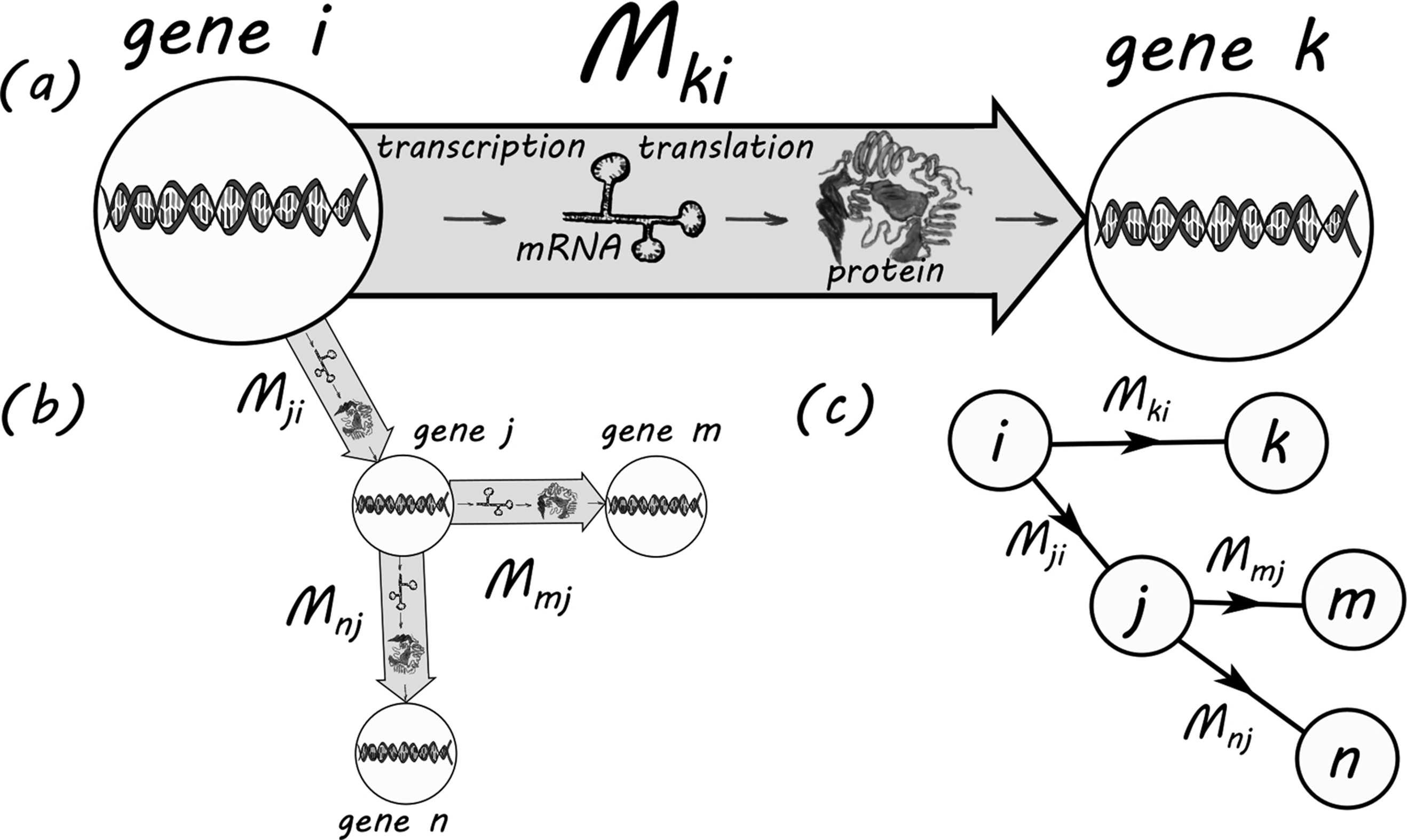 Figure1.1 SchematicviewofgeneticactivityandwhatalinkMki meansinageneticregulatory network.(a)Geneiactivatesgenekifsomethinglikethefollowingprocesstakesplace:theactivityof geneimeansthataspecificsub-sequenceofthedeoxyribonucleicacid(DNA)(gene)iscopiedintoa complementarystructure,anmRNAmolecule.ThismRNAmoleculefromgenei,mightget‘translated’ (copiedagain)intoaproteinoftypei.Thisproteincanbindwithotherproteinstoformaclusterofproteins, a‘complex’.SuchcomplexescanbindtootherregionsoftheDNA,say,theregionthatisassociatedwith genek,andtherebycausetheactivationofgenek.(b)Geneicausesgenejtobecomeactive,whichactivates genesmandn.(c)Theprocess,wheretheactivityofgeneitriggerstheactivityofothergenes,canbe representedasadirectedgeneticregulatorynetwork.Complexescanalsodeactivategenes.Ifgenejis active,acomplexmightdeactivateit.