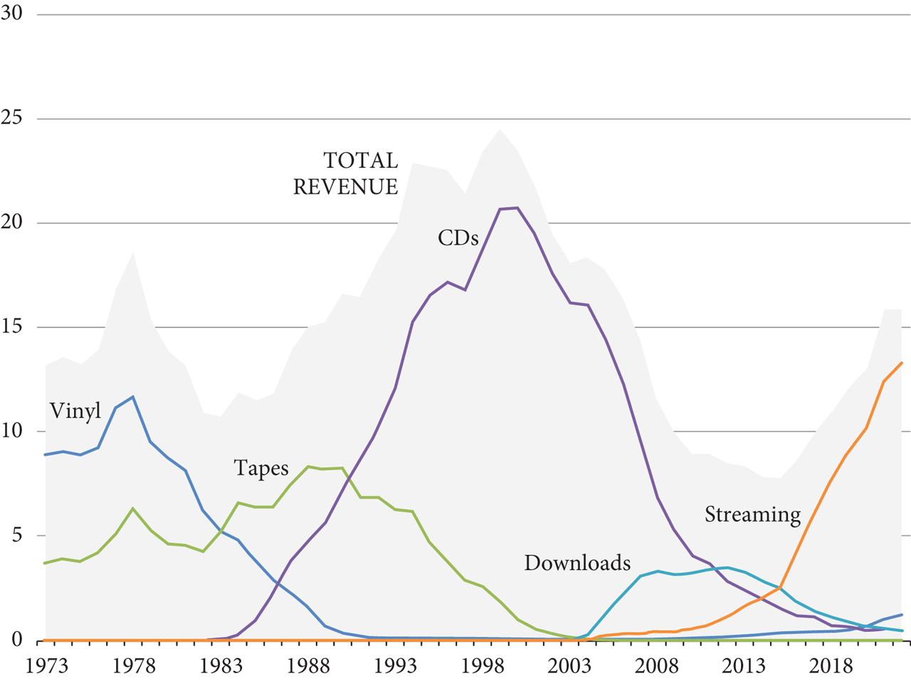 Figure 1.1 A half century of recorded music revenues by format, 1973-2022 (billions of dollars, adjusted for inflation). Source: RIAA.