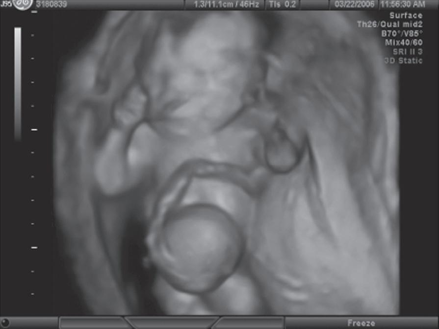 Fig. 2.1 Omphalocele at (A) 12 weeks, (B) 26 weeks, and (C) three-dimensional image at 22 weeks’ gestation.