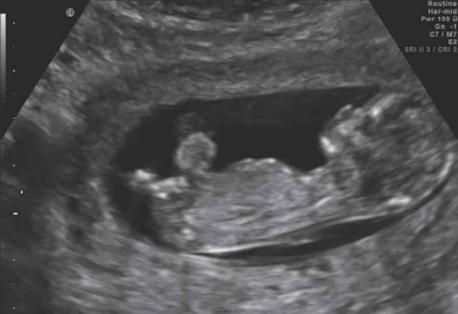 Since the 1980s, the addition of ultrasonography to the practice of obstetrics has allowed for the detection of significant fetal abnormalities prior to delivery (Fig. 2.1). About 20% to 27% of second-trimester fetuses with Down syndrome have a major anatomic abnormality.12 Over time, sonographic markers were identified that, when present, increase the likelihood that a chromosomal abnormality may exist. The risk increases as the number of markers increases. Sonographic markers are seen in 50% to 80% of fetuses with Down syndrome. The most common markers are cardiac defects, increased nuchal fold thickness, hyperechoic bowel, shortened extremities, and renal pyelectasis. When a second-trimester US is performed to search for these markers, it is called a “genetic sonogram.” The overall sensitivity of this US is 70% to 85%.