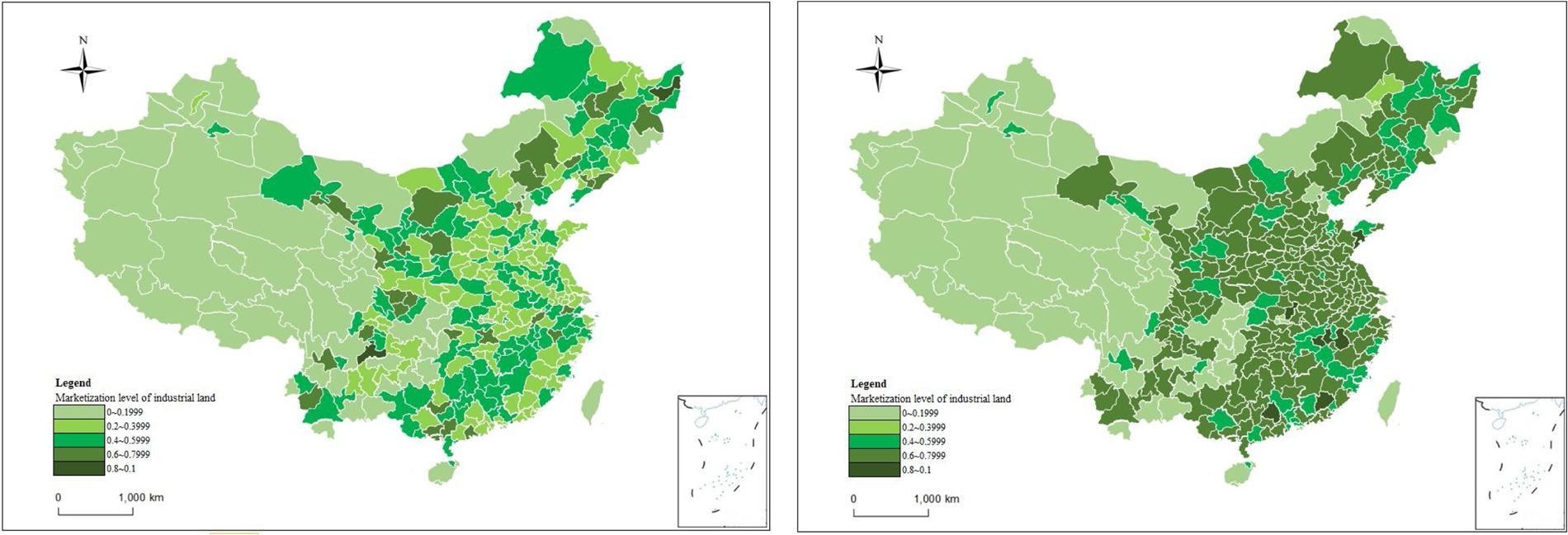 Fig.4. ThechangeofmarketizationlevelofindustriallandinChina,2007and2016.