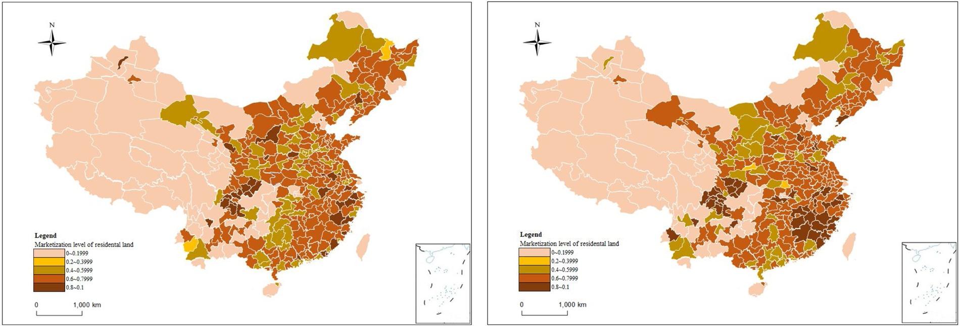 Fig.6. ThechangeofmarketizationlevelofresidentiallandinChina,2007and2016.