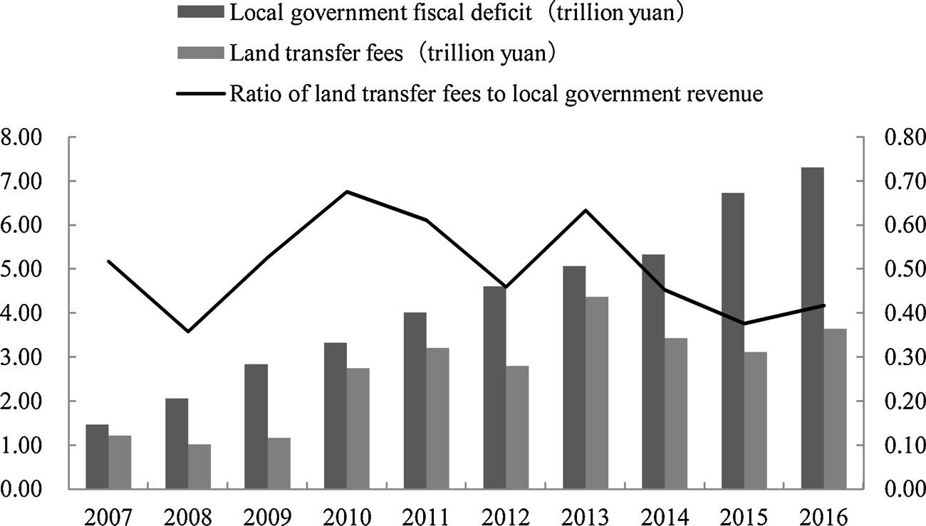 thelocalgovernmentrosefrom1.47trillionyuanin2007to7.31 trillionyuanin2016,anincreaseofnearly400%(Fig.1).Changesin deficitsincreasethedemandforgovernmentrevenueatthelocallevel (Panetal.,2015).Amongallfeasibleapproaches,landtransferfees havebecometheprimarysourceofextra-budgetaryincometocoverthe fiscaldeficitresultingfromdecreasesinfundingfromthecentralgovernment(LichtenbergandDing,2009; Lin,2007; LinandYi,2011; Fu, 2015),withamountincreasingfrom1.22trillionyuanto3.65trillion yuanduringtheperiodfrom2007to2016;althoughtheirproportion hasfluctuatedgreatly,landtransferfeeshaveprovidedupto36%of localgovernmentrevenue.1