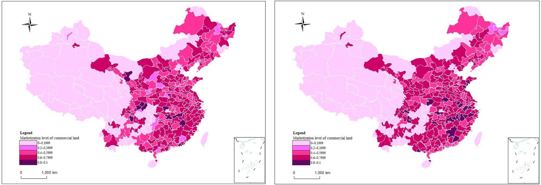 Fig.5. ThechangeofmarketizationlevelofcommerciallandinChina,2007and2016.