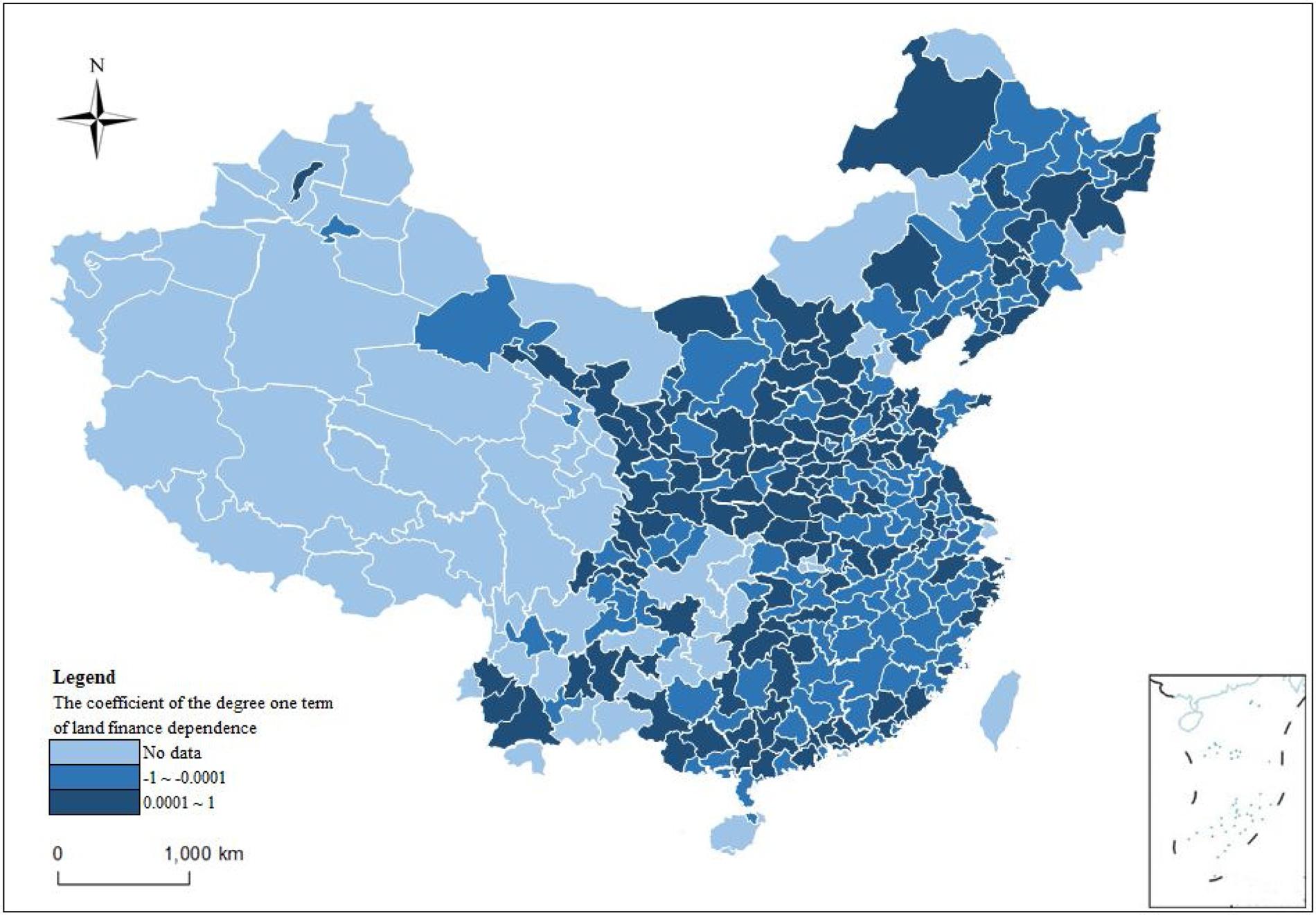Duetothedifferencesinnaturalenvironment,populationdensity andeconomicdevelopmentlevel,therearelargegeographicdifferences inlandusepolicies(Wangetal.,2018b).Thisalsoleadstoalarge spatialdifferenceinChina’slandfinancedependence.Observingthe degreeoflandfinancedependenceofvariouscitiesin2016,itcanbe foundthatcitiesineasterndevelopedregionssuchasNanjing, Changzhou,Jinan,andJiaxinghaveahigherdegreeoflandfinance dependence,respectively0.6063,0.5944,0.5265,and0.5163,much higherthantheaveragevaluein2016(0.2695).ThelandfinancedependenceofLongnaninthewesternregionisthelowest,only0.0086. Thedevelopedregionsintheeasthavelessfinancialpressureand weakerlandresourceendowment,butthelandfinancedependenceis thehighest;theunderdevelopedregionssuchasthewesternandcentral regionshavegreaterfinancialpressuresandstrongerlandresource endowment,buttheirlandfinancedependenceisrelativelyweak.The easternregionsaredenselypopulatedwithlimitedlandarea,resulting inscarcelandresources,butbecauseoftheirbettereconomicand technologicalconditions,thedegreeoflanduseandlandpricesare relativelyhigh(Wangetal.,2018a).