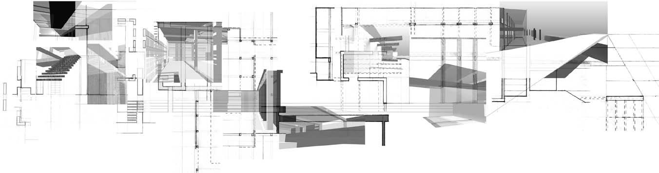 Figure 1.15. This document is a hybrid drawing of an itinerary through the spaces of a project. It integrates fragments of plan, section, and perspective as a study of the spatial and experiential consequences of tectonic assembly. It is used as a generative document—one from which new ideas emerge for design. It provides a point of departure for future design iterations. Student: maryJo mineriCh —CritiC: JameS eCkler inStitution: univerSity of CinCinnati