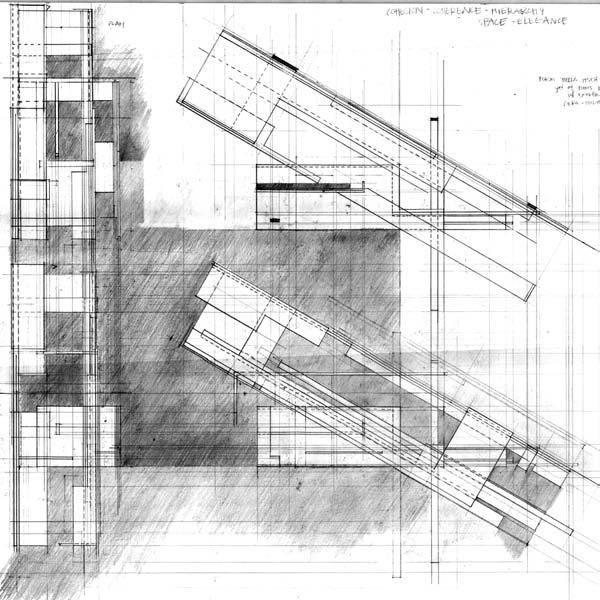 As opposed to the implicit information of abstraction and exploration, communicative composition relies on the explicit documentation of relationships. That documentation is meant to be clearly legible to a larger audience so that design ideas can be understood without explanation. This type of communicative composition often relies on conventions for representation—on a graphic language that is uniform and commonly accepted. At this stage in the process, composition becomes a tool for resolving more complex ideas. Here more responsibilities can be added to the process. Issues of proportion, organization, proximity, and hierarchy can be used to define issues of program, structure, scale, movement, and environment. Communicative composition is not necessarily relegated to documenting complete design ideas, but it can be used in bringing greater specificity to them. Whereas exploratory composition remains generic, communicative composition becomes specific through process.