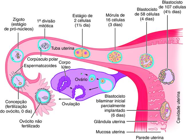 Do ponto de vista de um médico ou de um pai ou mãe em potencial, o desenvolvimento pré natal humano é subdividido em três intervalos principais, denominados primeiro, segundo e terceiro trimestres, ou seja, três períodos de 3 meses. Do ponto de vista de um embriologista, existem também três subdivisões do desenvolvimento pré natal humano, denominados período do zigoto (ovo), período embrionário e período fetal. Geralmente, considera se que o primeiro período, do zigoto ou ovo, se estende desde o momento da fertilização até a formação do blastocisto e sua implantação na parede uterina 1 semana após a fertilização (Fig Intro 1) O concepto (i e , o produto da concepção ou fertilização) tipicamente é denominado zigoto ou ovo durante esse período O concepto no estágio de blastocisto já se diferenciou para originar os tecidos destinados a formar o embrião, além de outros tecidos que irão formar as camadas extraembrionárias Durante o período do zigoto, os embriologistas humanos identificam três estágios de desenvolvimento: o zigoto propriamente dito (formado durante a fertilização, anterior a suas etapas multicelulares), a mórula (formada após o zigoto ter sofrido divisões mitóticas na clivagem, originando um agregado celular em formato de amora, constituído por múltiplas células ou blastômeros) e o blastocisto (uma esfera oca de células derivadas da mórula através da formação de uma grande cavidade central preenchida por líquido denominada blastocele). Durante esse período, o concepto pode também ser denominado embrião em pré‑implantação ou, mais precisamente, concepto em pré‑implantação Consequentemente, o período também pode ser denominado período do embrião ou do concepto em pré implantação O uso do termo ovo ou embrião para o concepto nessas etapas é particularmente útil nos casos de fertilização in vitro (ovos/embriões são coletados, ovos/embriões são lavados, ovos/embriões são transplantados para o útero Tente pronunciar essas expressões rapidamente usando “conceptos”!) Todavia, no sentido mais estrito, ovócito é o nome do gameta feminino antes da fertilização, o qual não deve ser confundido com o termo “ovo”, o qual se refere a um ovócito fecundado, ou seja, um futuro embrião a se desenvolver.