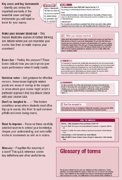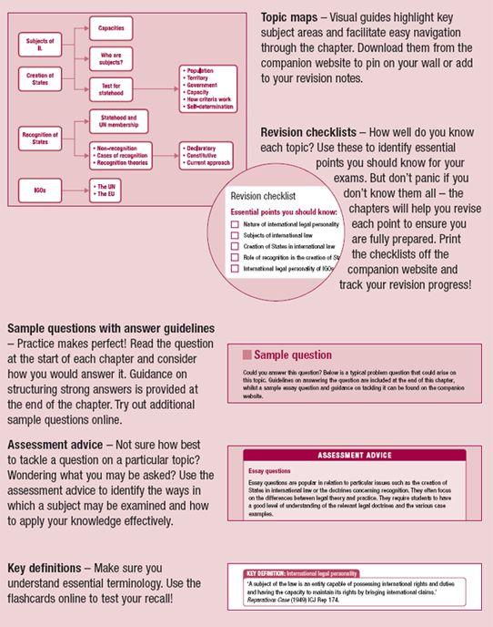 Another challenge that international law presents to students is the fact that its various topics are closely interrelated. An assessed question will often involve a number of discrete topics. Accordingly, you will need to acquire a sound knowledge of a wide range of topics and you will also need to understand how they relate to each other. This book advises you on the best way to enhance your technique of answering assessed problems and essay questions. It shows you how to identify the applicable law; how to construct relevant arguments by reference to the most appropriate legal sources; and how to relate the discrete topics of international law to one another in a structured and coherent manner.