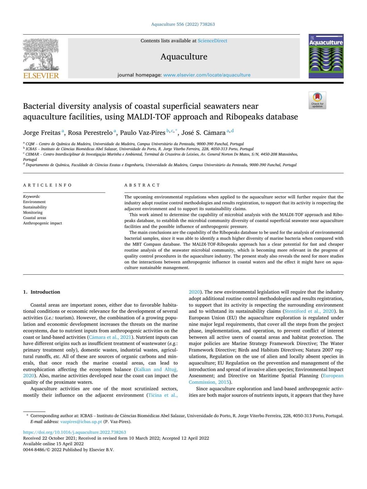 Bacterial diversity analysis of coastal superficial seawaters near aquaculture facilities, using MALDI-TOF approach and Ribopeaks database Jorge Freitas