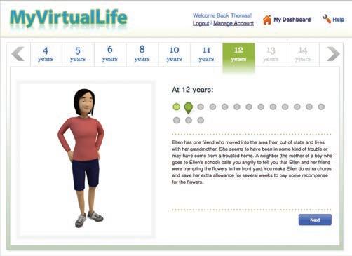 “Sally’s always been such a sweet child,” or “Uncle Julio’s mind is as sharp as ever.” And our powers of observation don’t stop with simple descriptions. We also come up with theories to explain our observations. Perhaps you’ve said something like, “Sally’s parents are great role models. That’s probably why she’s so well behaved,” or “Grandpa and Uncle Julio are both pretty sharp for their age. I guess they have good genes.” As these observations suggest, the developmental pathway that each person follows results from the person’s own characteristics, the choices that others make for her in childhood, and the decisions that she makes for herself in adulthood. These interactive effects are the driving theme behind MyVirtualLife, an online simulation that allows you to raise a child to adulthood and then adopt a first-person perspective to make decisions in adulthood.