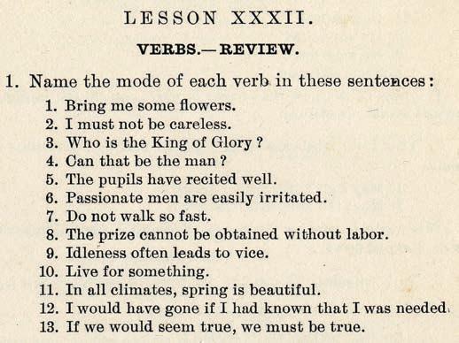 This page from the Hoenshel’s Complete Grammar, published in 1895, illustrates the influence of the doctrine of original sin on education and child rearing. Statements that promote religious and moral principles are embedded in this exercise on verbs. The idea was that the goals of teaching grammar to children and shaping their spiritual development could be, and should be, accomplished simultaneously.
