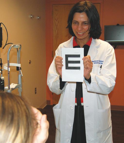 which the patient sees the letters and the denominator refers to the distance from which a patient with normal vision sees the same letters. The normal eye can resolve a figure that subtends a visual angle of 5 minutes at a distance of 20 feet. At the distance at which a normal patient can see a line of letters on a Snellen eye chart, the widths of the lines on each letter subtend a visual angle of 1 minute, or one-fifth of the entire letter.6 A fraction of 20/20 2 indicates the patient saw all the letters on the 20/20 line except two, while 20/20+2 means the patient was able to see the 20/20 letters plus two letters on the next (20/15) line. Usually up to two mistakes on a line or two extra letters on the next line are allowed in this notation. Most normal adults younger than 40 years have best corrected visual acuities of 20/20 or better in each eye.