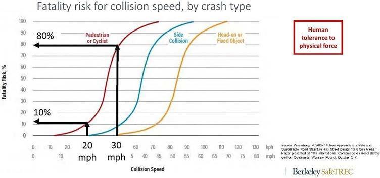 Along these lines, this book argues that we should pivot the planning, design, and operation of our streets around our most natural capacities as human beings—in short, our humanity. For instance, the chances of being killed as a pedestrian or cyclist grows exponentially with speed, ramping up most dramatically between about 20 and 30 MPH.f In our quest to understand the humanity of our streets, we should ask why might the middle point, 25 MPH, be significant? Is it possible that we, as a species, evolved to withstand collisions around the fastest speeds we can run? If so, shouldn’t we always argue for lower speed limits based on our physio-biological capacity as human beings? Further, if we can achieve some of the highest vehicle throughputs at around 25-30 MPH on surface streets, is there really any need for much higher speeds anywhere in or around our communities? In sum, we should let our humanity drive our decisions around our street ecologies rather than some preconceived needs of machines, and now roboticized automation.