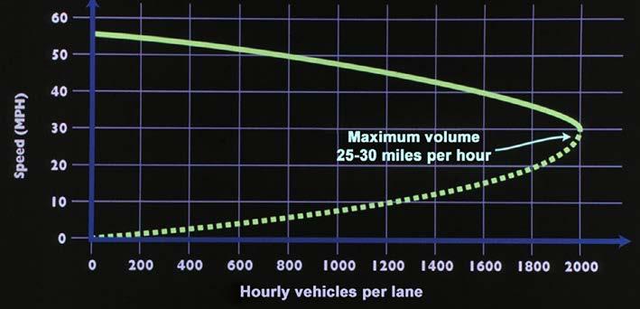 If we can achieve our greatest vehicle throughputs around 25 to 35 MPH on surface streets, why should traffic travel any faster? Courtesy: Walter Kulash. Source: Based on research in the 1985 Highway Capacity Manual, and a more recent 2002 study by Michael Li, “The Role of Speed–flow Relationship in Congestion Pricing Implementation with an Application to Singapore,”.