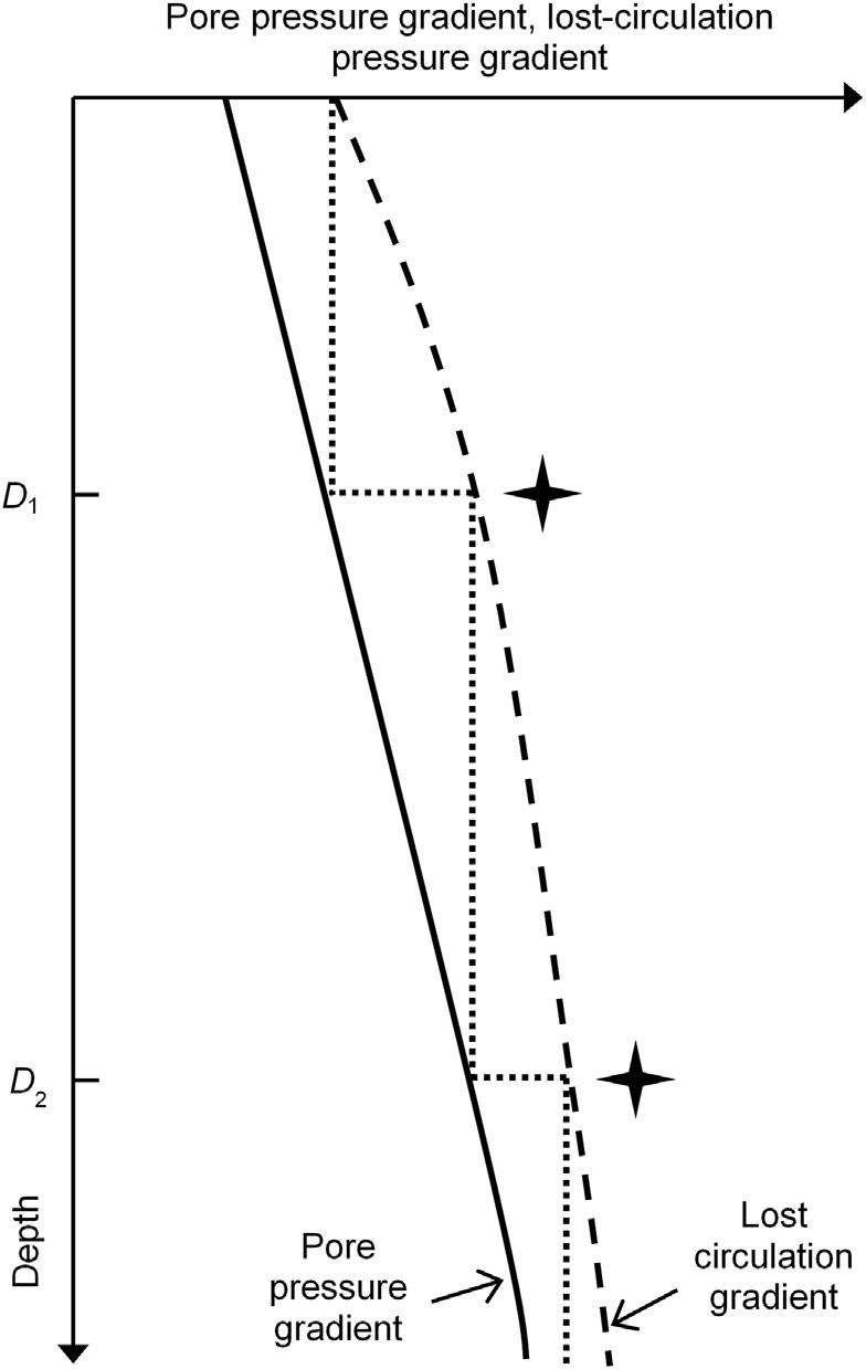 Lostcirculationisexacerbatedindeepwaterdrilling.Thefracturegradient isoftenquitelowindeepwaterwells [17] (Fig.1.4).Thisresultsinanarrow operationalpressurewindowinsuchwells.Exceedingthefracturegradient canleadtomudlosses.